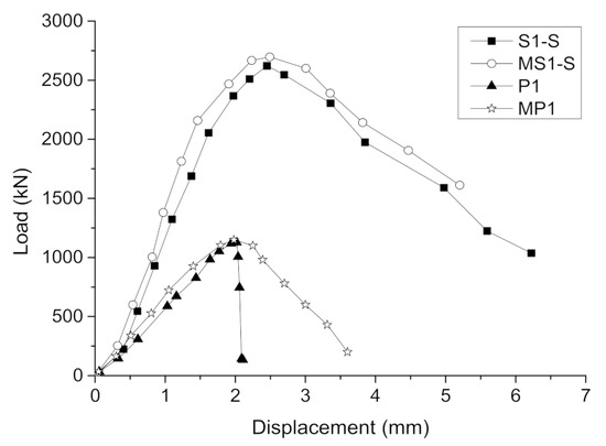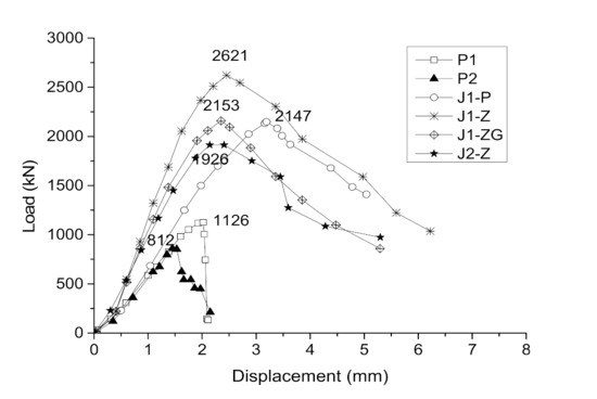 Figure 10 shows the load–displacement curves of specimens. The curves of all the specimens consisted of three stages: elasticity, elastoplasticity, and failure. In these curves, the load–displacement relationship of the unreinforced column was consistent with the axial compression test of the plain concrete column [25]; that is, from the beginning to 80% of the peak load was the elastic stage, then the crack occurred at the beginning of the elastoplastic stage and the slope of the curve gradually decreased until the bearing capacity reached the peak, and finally the bearing capacity decreased rapidly until failure. It should be noted that the failure characteristic for specimen P1 was brittle failure. For the strengthened specimens, the load–displacement curves were similar. From the beginning to 80% of the peak load was the elastic stage. After this, the stiffness of the specimens gradually decreased with the development of the crack and the bearing capacity reached the peak when several segments broke. This process was referred to as the elastoplastic stage. Finally, the failure stage was reached. The bearing capacity of the specimen decreased until it failed and the descending speed was slower than that of the unreinforced column, showing the ductile failure characteristics of the strengthened specimens. The slopes of the load–displacement curves for the strengthened specimens were larger than those of the corresponding unreinforced columns, indicating that the stiffness increased after strengthening. In the same way, the slopes of the curves for the self-stressed strengthened specimens were larger than that of the ordinary strengthened specimen, indicating that self-stress enhances the stiffness of the strengthened specimens.