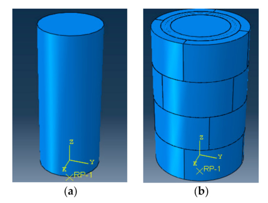 Finite element model. (a) Model of specimen P1; (b) Model of specimen S1-S.