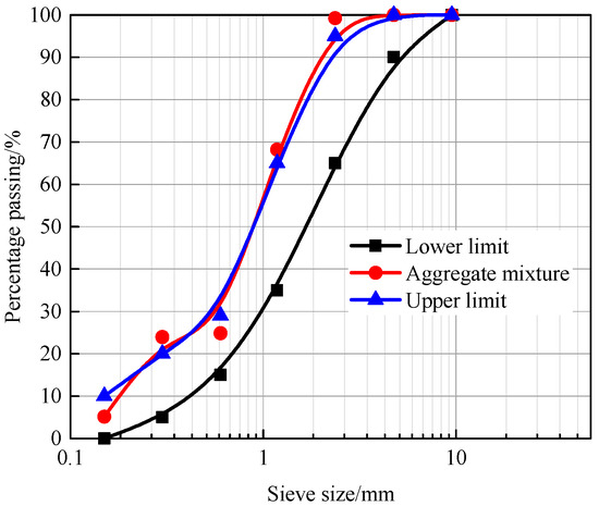 Ordinary Portland cement P.O 42.5 was used for preparing concrete specimens, which is produced by Yatai Group Co., Ltd (Jilin, China). The density of the cement is 3105 kg/m3, the specific surface area is 330 m2/kg. The initial and final setting times are 155 and 215 min, respectively. The compressive strengths at 7 and 28 days are 26.2 and 48.8 MPa, the flexural strengths at 7 and 28 days are 5.6 and 8.5 MPa, respectively. The common natural river sand was used with a fineness modulus of 2.66, and its particle size distributions are illustrated in Figure 1. Crushed stones with apparent density of 2710 kg/m3 and continuous gradation from 5 to 31.5 mm were chosen as coarse aggregates. In addition, a modified FDN superplasticizer was used with a mixing amount of 0.8% (by the weight of cement), the pH value of the FDN superplasticizer (Xingzhenghe chemical Co., Ltd, Shenyang, China) was 8.19, and the water reducing rate was 21%.