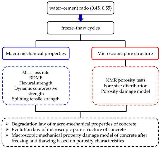 The flow chart is shown in Figure 2. For each mixture, there were 12 prism specimens with dimensions of 100 × 100 × 400 mm for rapid freeze–thaw test, three of which were used to measure the mass loss, RDME after every 25 freeze–thaw cycles. In addition, the remaining prism specimens were used to measure the flexural strength, and then drill cylinder cores (diameter × height, 50 × 100 mm) to measure the porosity after different freeze–thaw cycles. Additionally, the cube specimens were fabricated to obtain compressive strength. For each mixture, the strength tests were conducted on three parallel specimens and the averaged results were presented.