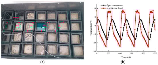 The rapid freeze–thaw method used in this test was based on the Chinese national standard GB/T 50082-2009 [37], which is similar to the standard ASTM C666/C666M-15 [38]. Each freeze–thaw cycle was completed within 3–4 h. During each cycle, the maximum temperature and minimum temperature at the center of the specimen was controlled at 5 ± 2 °C and −18 ± 2 °C, respectively. The rapid freeze–thaw testing machine and temperature change curve of the freeze and thaw cycles are plotted in Figure 3a,b, respectively.