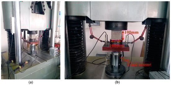 The mechanical tests were conducted on a WAW-2000 kN microcomputer controlled electro-hydraulic servo test system (Keda, Changchun, China) Two displacement sensors were placed on the two sides of the cube specimen to record their deformation during the loading process. Figure 4 shows the diagram for uniaxial compression test. Before formal loading, the cubic specimen was first preloaded with 5 kN to ensure that the loading plate is in full contact with the surface of the specimen. After that, the loading was carried out according to the determined loading rate until the specimens failed.