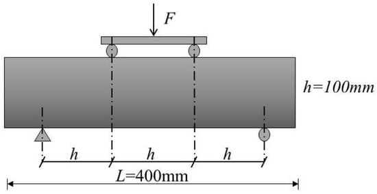 The flexural strength and splitting tensile strength of concrete are another key property for evaluating the durability of concrete. In this test, the flexural strength and splitting tensile strength of the concrete specimens with different w/c ratios under freeze–thaw cycles were tested, according to Chinese standard specification GB/T 50081-2019 [39] and ASTM C78/C78M-18 [41]. The flexural strength test loading schematic is shown in Figure 5.
