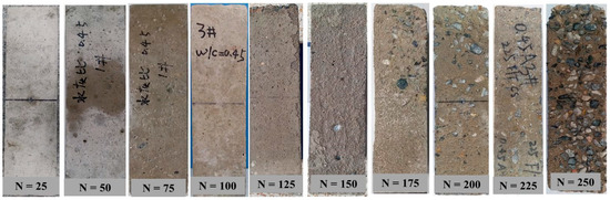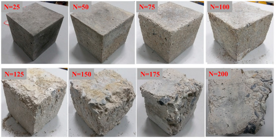 Figure 7 demonstrates the typical failure characteristics of concrete specimens under different freeze–thaw cycles. As can be seen in this figure, with the increasing number of freeze–thaw cycles, the surface of the concrete prismatic specimen becomes less flat, the mortar falls off, and the phenomenon of exposed aggregates becomes more and more serious. Before 75 cycles of freeze–thaw, there is no obvious change in the appearance of the prism specimens, the shape and size of the specimens maintained its integrity. After nearly 125 cycles, only slight scaling of the cement mortar paste separated from the aggregate appeared on the surface of the specimen. After 150 freeze–thaw cycles, it can be observed that the surface cement mortar around the aggregate gradually wrinkled and peeled off. With the increasing cycles, the appearance of the specimen is changed obviously. In addition, holes and cracks were observed easily in some areas of the specimen. After nearly 200 cycles, the cement mortar paste on the surface was completely flaked off, and the coarse aggregate is also completely exposed (see Figure 7 N = 200 cycles). Around 225–250 freeze–thaw cycles, the surface of the prismatic specimen was hardly wrapped with mortar, and the corners were severely damaged.