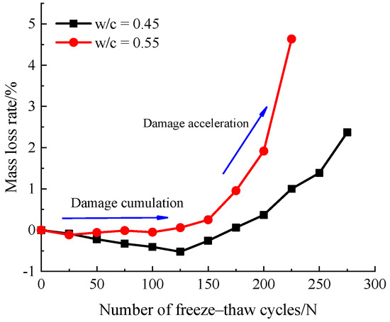In addition, it is clear that the relationship between mass loss rate and freeze–thaw cycles exhibit the two distinct stages. In the first 0–125 freeze–thaw cycles, it can be identified that in the damage accumulation stage, the weight of concrete specimens shows a slightly increasing trend or is basically unchanged. However, after 150 freeze–thaw cycles, the mass loss rate increases significantly for the 0.45, 0.55 water–cement ratio specimens, which can be identified as the damage acceleration stage.