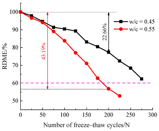 The RDME can reflect the state of micro-crack development inside the concrete, the lower the RDME means the more serious degree of freeze–thaw damage. Figure 10 shows the degradation of the relative dynamic modulus of elasticity of the concrete specimens with the different water–cement ratio under the condition of freeze–thaw cycles. As shown in Figure 10, it can be seen that with the number of freeze–thaw cycles increased, the RDME of the concrete specimens decreased gradually. Before 75 freeze–thaw cycles, there was no significant difference in RDME between the two groups of concrete specimens. Nevertheless, after 100 freeze–thaw cycles, the RDME of the specimens with a water–cement ratio of 0.55 degraded more sharply than that of the specimens with a water–cement ratio of 0.45. At the end of 150 freeze–thaw cycles, the RDME of the specimens with water–cement ratios of 0.45, 0.55 are 83.12%, 71.05%, respectively. Around 200 freeze–thaw cycles, the RDME of concrete specimens decreased by 22.66%, 43.19%, respectively. The results indicate that the specimens of 0.55 water–cement ratio had reached the final number of freeze–thaw cycles, According to the standard GB/T 50082-2009. However, after 275 freeze–thaw cycles, the RDME of specimens with 0.45 water–cement ratio decreased by 37.6%. The results also indicated that there was significant difference in the rate of deterioration of different w/c ratios under the same number of freeze–thaw cycles; the higher the w/c ratio of concrete specimens, the faster the degradation rate.