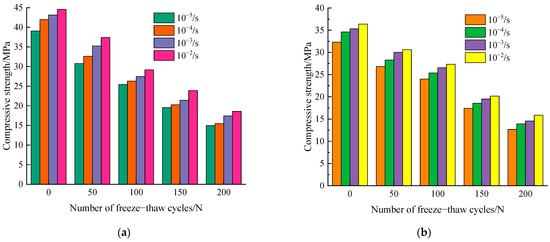 In order to study the evolution of dynamic mechanical properties of concrete subjected to freeze–thaw, uniaxial compressive strength tests were conducted on cube specimens under different loading rates. In this test, compressive strength tests of the cubic specimens after each 25 freeze–thaw cycles were conducted, according to Chinese standard specification GB/T 50081-2019 [39], which is similar to the Standard test method for compressive strength of cylindrical concrete specimens (ASTM C39/C39M−18) [40]. The loading was carried out in the form of displacement control. The loading rates were 0.06, 0.6, 6, and 60 mm/min, respectively. The strain rates corresponding to the four loading rates were 1 × 10−5/s, 1 × 10−4/s, 1 × 10−3/s, 1 × 10−2/s, respectively.