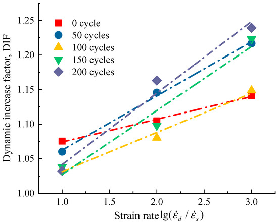 Taking the w/c = 0.45 as an example, Figure 13 presents the relationship between the DIF of uniaxial compressive strength with strain rate after frost damage. It can be visualized from the figure that the dynamic increase factor of concrete after freeze–thaw increases gradually with the increase of strain rate. The relationship between the DIF and the log strain rate was fitted according to Equation (4), we found a good linear relationship between the DIF and the log strain rate under the different freeze–thaw cycles. The regression equations and correlation coefficients of DIF and strain rate for different numbers of freeze–thaws are presented in Table 2. These regression equations are similar to that proposed by Han et al. [20]. As can be seen in Table 2, the slope of the fitted regression equation gradually increases after frost damage, which indicates that the increase of freeze–thaw cycles improves the rate sensitivity of concrete.