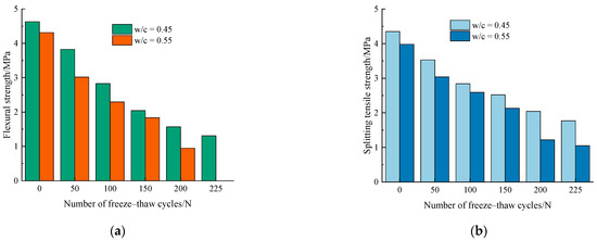 As shown in Figure 14a, the flexural strength of concrete specimens for both water–cement ratios decreased gradually with the increase in the number of freeze–thaw cycles. For concrete specimens with 0.55 water–cement ratio, the flexural strength decreased significantly after 50 times of freezing–thawing. After 100 cycles of freezing and thawing, it is noted that the flexural strengths of the specimens with w/c = 0.45 and 0.55 are 2.83 MPa, 2.29 MPa, respectively. With the accumulation of the degree of freeze–thaw damage, after 200 freeze–thaw cycles, the concrete specimen with 0.55 water–cement ratio has a flexural strength of only 0.95 MPa, which has basically lost its load-bearing capacity.