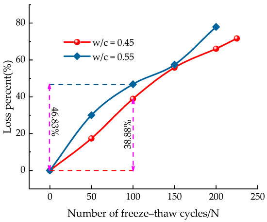 The relationship curves of mass loss rate of concrete specimens with the number of freeze–thaw cycles for different water–cement ratios are shown in Figure 9. As shown in this figure, the mass loss rate of both concrete specimens first decreased and then increased over the whole process of freeze–thaw cycles, which is accordance with results from Fang et al. [43]. For the w/c = 0.45 group, the mass of specimens increased slightly before 125 freeze–thaw cycles. This is attributed to the capillary pore water absorption and further hydration of cement paste. Subsequently, with the increase of freezing and thawing cycles, internal micro-cracks and pores of the concrete were gradually expanded and became connected which made the surface of specimen gradually crumbled. For the 0.55 water–cement ratio, the mass loss rate of the concrete prismatic specimens did not change significantly before 100 freeze–thaw cycles. However, after 150 freeze–thaw cycles, the mass loss rate of specimens has an obvious turning point, and it decreased more acutely than the degradation of the 0.45 water–cement ratio. At the 225 freeze–thaw cycles, the mass loss rate of concrete specimen with 0.45, 0.55 water–cement ratios were 1.004%, 4.636%, respectively. From Figure 9, it can be demonstrated that, specimens of 0.55 water–cement ratio failed after 250 cycles, while specimens of 0.45 water–cement ratio were still less than 5% after 300 cycles.