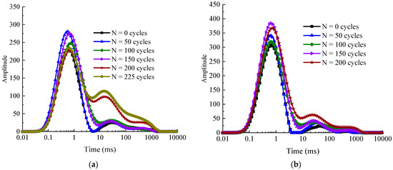 Figure 16 illustrates the typical T2 transverse relaxation time distribution curves of the specimens with different water–cement ratios under different freeze–thaw cycles. From the figure, it can be seen that the transverse relaxation time T2 distribution curves contains three peaks, which corresponds to the variations of micro-pore, meso-pore, and macro-pore from left to right, respectively. The area occupied by the leftmost peak is the largest, which indicates that the micro-pores occupy the large proportion of the total number of pores. At the beginning and early stages of freeze–thaw cycles (0–50 cycles), the 3rd peak is not obvious, and with the increase of the number of freeze–thaw cycles, the pore structure of the concrete core sample changes, and the proportion of the 2nd and 3rd peaks gradually increases, while the 1st peak gradually decreases, which means that the freeze–thaw cycles make the internal micro-pores gradually expand and penetrate, making the micro-pores gradually evolve into medium and large pores. After 200 freeze–thaw cycles, the increase of the 2nd and 3rd peaks on the right side of the T2 relaxation time curve was significantly higher than that of the 1st peak, indicating that the micro-pores and meso-pores inside the concrete continuously expand and penetrate into macro-pores. This indicates that with the accumulation of frost damage, the external moisture continues to migrate into the newly generated pores, generating the internal frost heaving pressure and osmotic pressure of concrete increasing, the pore structure continues to deteriorate, small pores continue to develop, expand, and even penetrate, forming medium and large pores [36,44].