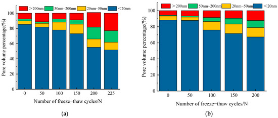 Pore size distribution of concrete with different w/c ratios after freezing–thawing damage. (a) w/c = 0.45; (b) w/c = 0.55.
