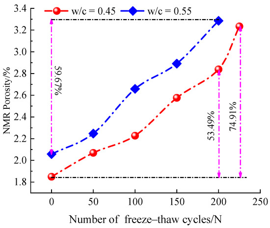 The porosity is a significant property used to quantify the pore structure of concrete. Figure 18 demonstrates the porosity variation of concrete cylinder specimens with different w/c ratios after different freeze–thaw cycles. It can be seen that the porosity of concrete core samples gradually increased with the increase of the number of freeze–thaw cycles, which implies the internal damage of concrete samples becomes more and more serious. After 200 freeze–thaw cycles, the NMR porosity of 0.45 and 0.55 water–cement ratios increased by 53.49% and 59.67%, respectively. However, the porosity of 0.45 water–cement ratios showed significantly faster growth after 225 freeze–thaw cycles.