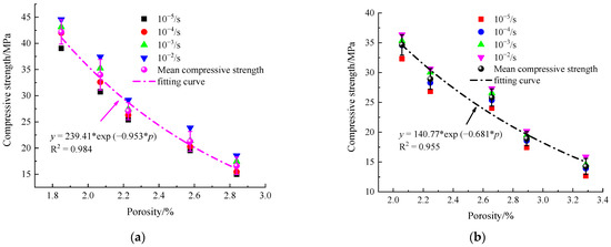 Relationship between compressive strength of concrete with different w/c ratio and porosity. (a) w/c = 0.45; (b) w/c = 0.55.