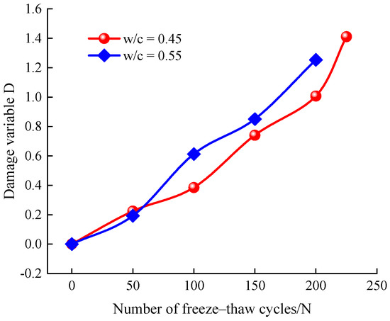 The damage variables of porosity of concrete after different number of freeze–thaw cycles were calculated according to Equation (5), as shown in Figure 20. As can be seen from the figure, with the increase of the number of freeze–thaw cycles, the damage variables of concrete specimens with both water–cement ratios gradually increased, indicating that the freeze–thaw action made the concrete damage gradually intensify, but there is a certain difference in the increased rate of the damage degree of specimens with different water–cement ratios, and the damage degree of specimens with 0.55 water–cement ratio was greater than the damage deterioration degree of 0.45 water–cement ratio under the same number of freeze–thaw cycles.