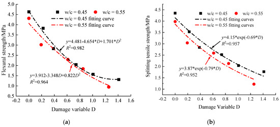 Relationship between mechanical properties of concrete specimens with different w/c ratio and damage variable. (a) Flexural strength and damage variable; (b) splitting tensile strength and damage variable.