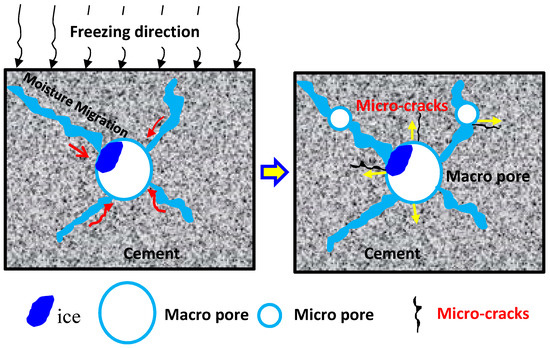 The main reason for the concrete failure under freezing and thawing cycles is the generation, expanding, and developing of micro-cracks inside the concrete. The test results of Luan et al. [48] showed that the water absorption of concrete increased significantly after freezing and thawing, and the degree of water saturation increased rapidly. When the temperature drops below 0 °C, the moisture in capillary pores inside the concrete phases into ice and expands by about 9% of its volume [3,10]. During the freezing process, unfrozen water gradually migrates around the frozen macro-pores. The migration of the pore solution eventually creates hydrostatic and osmotic pressure. When the expansion force exceeds the tensile strength of the capillary wall, the micro-cracks start to expand around and gradually penetrate in cement. Under the action of hydrostatic pressure, the weak surface of large pores will be destroyed first and then generate secondary pores around the large pores. Based on the test results, a conceptual model for the moisture migration in different sized pores during the freezing process induced concrete deterioration is shown in Figure 22.