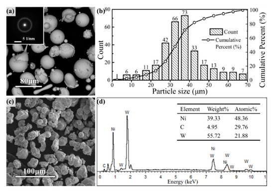SEM micromorphology of the feedstock powders: (a) surface morphology and the SAED pattern of Fe-based amorphous powders; (b) granulometric distribution of Fe-based amorphous powders; (c) surface morphology of the reinforcing phase particles; (d) chemical component of the WC wrapped by Ni.