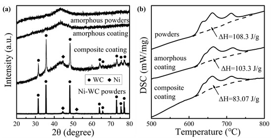The comparison of the XRD patterns showed that both coatings exhibited a broad diffuse peak representing the amorphous structure at about 2θ = 44°. There were no obvious crystal diffraction peaks in the amorphous coating, which was consistent with the SAED results. Crystal diffraction peaks in the composite coating matched the typical diffraction peaks of the Ni-WC particles. After quantifying the crystallizing enthalpies (ΔH) of the coatings in DSC curves, the amorphous fraction rate (R) of the coatings could be calculated due to the completely amorphous microstructure of the powders by the formula: R = ΔHoating/ωΔHpowders × 100% [24]. Amorphous coatings and composite coatings had amorphous fraction rates of 95.38% and 90.24%, respectively, owing to the high cooling rate provided by the inert gas cooling system.