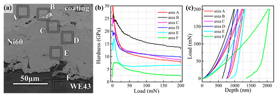 Mechanical properties at different areas of the coating cross-section: (a) selected areas of nanoindentation; (b) hardness-load curves; (c) load-depth curves.
