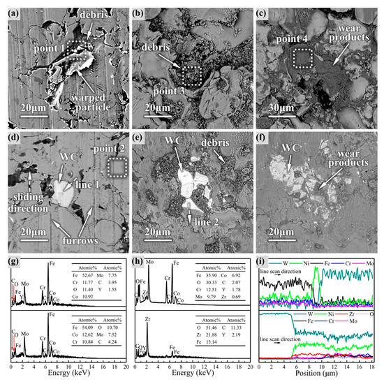 It is obvious from Figure 6a that the bonding failure and warping of some particles on the surface of the amorphous coating appeared after 5 min of wear, accompanied by the generation of debris. However, in the composite coating in Figure 6d, there was no obvious warping, and the furrow depth became shallower after the passage of WC. EDS of the coatings in Figure 6g revealed that there were basically the same elemental composition and slight oxidation on the surface of both coatings. In the intermediate stage in Figure 6b,e, the degree of oxidation increased; further, the proportion of Fe decreased, and Zr appeared in the wear debris, which indicated that the friction pair also began to disintegrate. Obvious particle exfoliation occurred on the surface of the amorphous coating, and the debris was dispersed in the pores and the intersplats between the particles. Compared with the amorphous coating, the composite coating had a much smoother surface, and most of the debris was gathered around the WC particles. The EDS line scan in Figure 6i revealed that active Ni diffusion occurred through the wear direction at the amorphous/WC interface. At the end of the wear process, the debris was transformed into fine-sized wear products that filled the concave positions, as shown in Figure 6c. The Fe content decreased further, while the O content increased further, and the Zr content increased sharply in the wear products. The exfoliation of the amorphous coating was further aggravated, and many fresh surfaces of the particles were exposed. However, the surface of the composite coating was still smooth without exfoliating, and the wear product was less than that of the amorphous coating from Figure 6f.