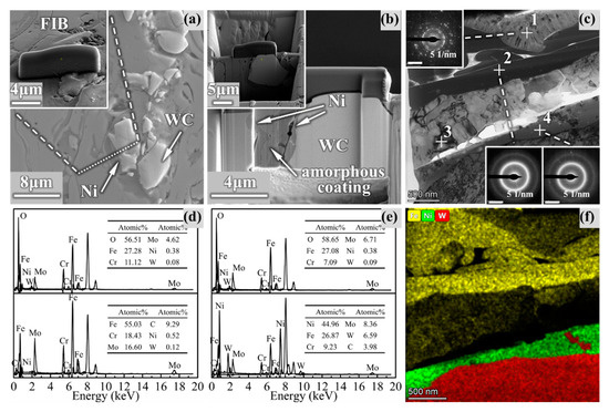 Microstructure analysis of the interface of amorphous/reinforcing phase particles: (a,b) the process of selecting target region and preparing TEM sample by FIB thinning technique; (c) morphology and SAED pattern of the Ni transition layer at the amorphous/WC interface; (d) EDS at point 1 and point 2; (e) EDS at point 3 and point 4; (f) map scanning of the main elements around the interface.