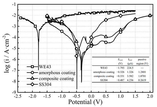 Figure 8 exhibits the Tafel polarization plots of WE43 and coating in relation to SS304 stainless steel. The fitting results revealed that the coatings had a higher corrosion potential (Ecorr) than SS304 and much higher than WE43, indicating that the coatings had a lower corrosion tendency. The corrosion current (Icorr) of the corrosion coatings was less than that of SS304, while the current of the amorphous composite coating was the smallest, which was two orders of magnitude lower than that of the substrate. Both of the two coatings had a wider passivation region than SS304, and the amorphous coating had the best passivation performance because its passivation current is ~10−4.5 A, which is the minimum value of the passivation current of SS304. It is acceptable that Fe-based amorphous coating improved the corrosion resistance of the magnesium alloy surface, and the overall corrosion resistance performance was better than that of stainless steel.