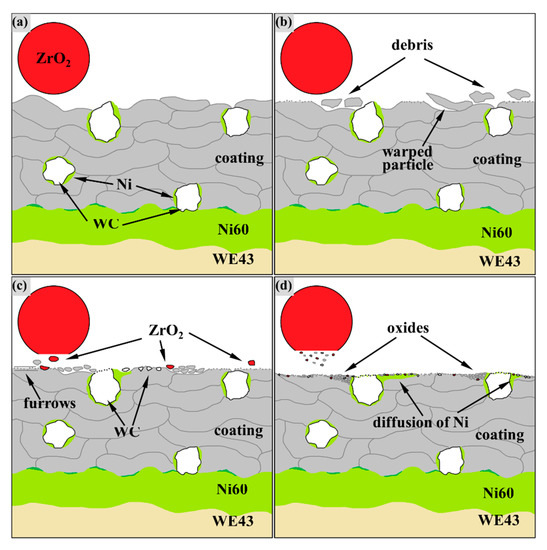 The schematic of amorphous coating wear process: (a) the contact of the coating and the ZrO2 friction ball; (b) fragments from sheared protruding particles and warped particles in the running-in stage; (c) the fragments are ground into debris, and the Ni layer begins to spread in the middle wear stage; (d) the products of oxidation wear are well mixed with the Ni layer after diffusion.