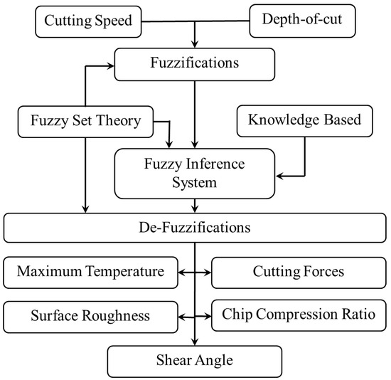 Figure 1 presents the conceptual illustration of the developed fuzzy inference systems for the calculation of the maximum process zone temperature, cutting forces, surface roughness, CCR, and SA in CT and UVAT at the selected range of input parameters.