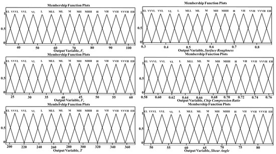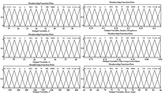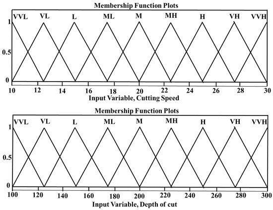 The two input variables V and DoC were divided into 9 fuzzy sets, which were represented as very-very-low (VVL), very-low (VL), low (L), medium-low (ML), medium (M), Medium-high (MH), high (H), very-high (VH), and very-very-high (VVH) in both the CT and UVAT in the developed fuzzy inference systems. The feed rate in the developed models was assumed to be constant at 0.1 mm/rev. Additionally, the output variables were distributed into 16 fuzzy-sets, i.e., extremely-low (EL), very-very-very-low (VVVL), very-very-low (VVL), very-low (VL), low (L), medium-low-low (MLL), medium-low (ML), medium (M), medium-high (MH), medium-high-high (MHH), high (H), very-high (VH), very-very-high (VVH), very-very-very-high (VVVH), and extremely-high (EH). The defined input variables with their related membership functions are given in Figure 2. The output variables for the UVAT and CT systems with their associated membership functions are presented in Figure 3 and Figure 4, respectively. Additionally, additional information and terminology considered for the defined input and output fuzzy sets used in the simulations of the CT and UVAT processes are listed in Table 2 and Table 3, respectively.