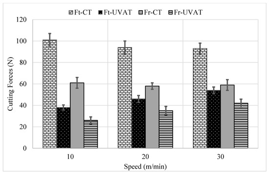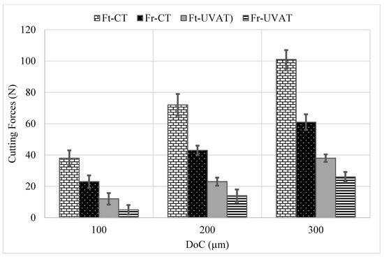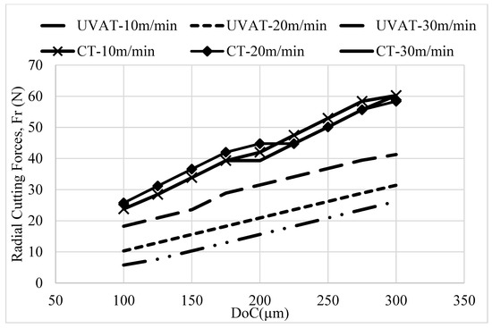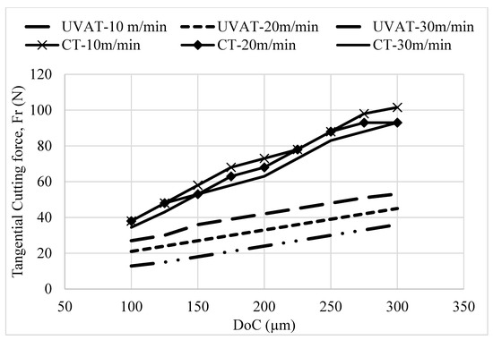 The cutting forces were measured at various cutting speeds in CT, and it was found that speed has no significant effect on it (see Figure 12). However, in the UVAT process, a gradual increase in Ft and Fr was recorded with an increase in cutting speed. The Ft merely increased from 38 to 54 N when the speed was increased from 10 to 30 m/min and DoC = 300 µm. The same trend was also seen at lower DoCs.