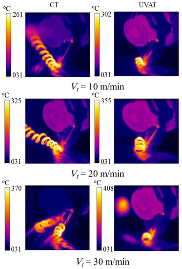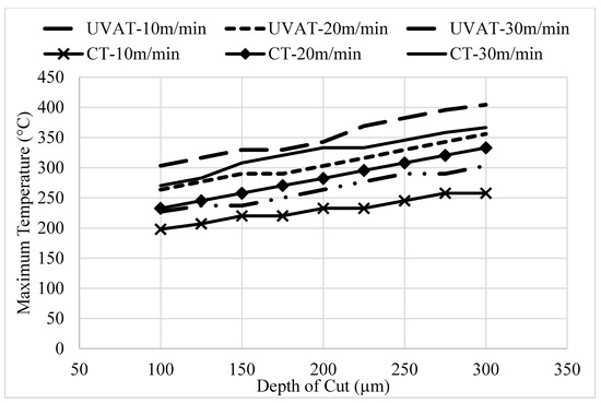 The maximum temperatures recorded during the CT and UVAT processes are shown in Figure 13. A slightly higher temperature level was recorded in UVAT (408 °C) when matched to CT (327 °C) at the 30 m/min cutting speed and the 300 µm DoC. The same trend was observed in all of the tested cutting conditions. The increase in temperature can be linked with escalation in the relative velocity of the tool in one complete vibrational cycle and with the additional power provided to the cutting edge in the form of vibration [7,42,43]. The same trend was observed when the DoC was increased as well; however, the impact of speed is foremost, as expected [39,40,46].