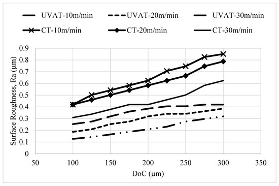 The developed simulation models were utilized to predict the surface roughness parameter (Ra) for the tested combinations of speed and DoC, as demonstrated in Figure 8. The model predicted a significant improvement in Ra due to the ironing effect of the cutting insert on the machine surface. Similarly, the models developed for the UVAT and CT processes predicted an improvement in the surface quality with a growth in cutting speed, which is in good agreement with work of Silberschmidt et al. [44].