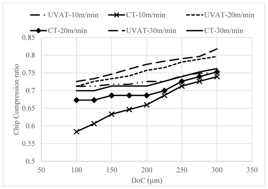 The developed model was also used to predict the CCR and SA of the formed chips at various speed and DoC combinations. The predicted levels of CRR and SA are presented in Figure 9 and Figure 10, respectively. The models predicted a gradual increase in the CCR, showing growth in the speed and DoC in the studied processes [45]. However, the CCR in UVAT is significantly higher when matched to the CCR in CT.