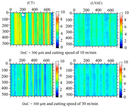 The quality of the product is assessed through many factors, but one of the most prominent factors is the surface topography of a machined part. A substantial enhancement in the machine surface quality was achieved in the UVAT process when judged with CT in the same cutting conditions as those presented in Figure 14. The Ra value measured at 30 m/min in CT was still higher when compared to that obtained during the UVAT process at 10 m/min. The tool movement in one complete vibration cycle produced an ironing effect on the turned surface, and a reduction of approximately 36–50% in the Ra was achieved at all of the tested conditions in the UVAT process when matched to CT.