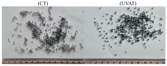 The studied alloys resulted in discontinuous chips in the CT and UVAT processes in all of the tested conditions. The chips were analyzed for CRR and SA calculations. The chip size produced during UVAT was substantially smaller when matched to the chip produced during CT in the same cutting conditions. The discontinuity of the chips resulted from the addition of Nd, which has a lower melting temperature. The chip samples from the UVAT and CT processes are presented in Figure 15.