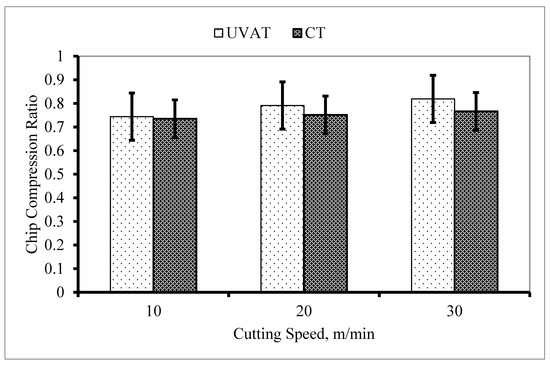 The calculated CCR in the UVAT process was slightly higher than that of CT, as presented in Figure 16, and the possible reason for this is the vibration imposed on the cutting insert. A minor increase in the CCR was observed with an increase in cthe utting speed during both CT and UVAT, as expected