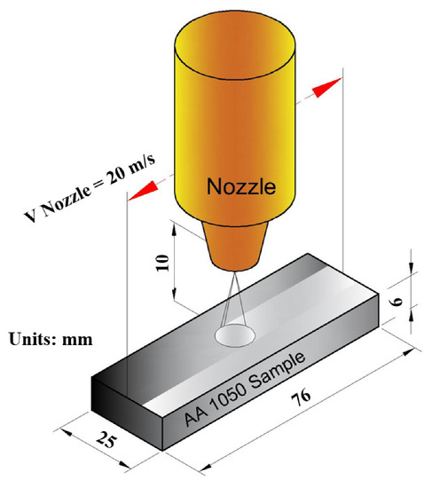 SP was performed on the metallographically prepared AA1050 Al alloy samples with stainless-steel shots (diameter: 0.7–1.0 mm (type: Chronital S60), shot hardness: 450 HV) as detailed elsewhere [55,56]. Figure 1 shows the SP of AA1050 by highlighting some of the important parameters and dimensions. It was carried out using a custom-designed automatic-controlled SP system including an air compressor, a dehumidifier, a pressure regulator, and a blasting cabinet along with other related pneumatic equipment such as valves and pipes. The peening parameters were: impingement pressure of 0.1 and 0.5 MPa, surface cover rate 100% and 1000%, impingement angle of 90°, a working distance of 10 mm, and a nozzle speed of 20 mm/s. Finally, the peened samples were ultrasonically cleaned in alcohol for 10 min, and the variation in the mass of the peened samples was measured using an electronic balance (accuracy: ±0.1 mg). A robust image analyzing method was applied to the peened samples using optical microscope images and ImageJ® (version 1.52p, 2021, National Institutes of Health, Bethesda, MD, USA) to determine the peening time needed to reach the full cover rate at peening pressures of 0.1 and 0.5 MPa. Then, the peening time was varied to achieve 100% and 1000% cover rates, where the cover rate was adjusted by estimating the peening time using the time needed for full coverage (100%) [35,57,58]. A minimum number of five samples were prepared and tested.