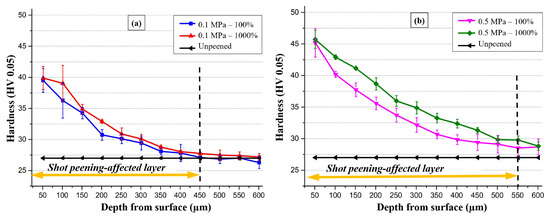 The SP-affected layer is a measure of the intensity of the plastic deformation that occurred due to the high kinetic energy of the impact of shots [42]. The depth of the peening-affected zone is around 450 µm and 550 µm for peening pressure of 0.1 MPa and 0.5 MPa, respectively (Figure 2). The maximum microhardness observed at the surface decreases rapidly with an increase in depth ~50–100 µm below the surface.
