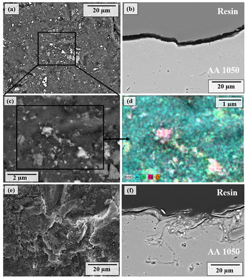 A large fragment of shots embedded onto the surface can be seen in Figure 4c, also confirmed by the EDS analysis (Figure 4d). This proves that the penetration of the shots is higher at 0.5 MPa compared to that of 0.1 MPa as larger shot fragments can be embedded onto the surface. The material pile-up is more evident in the cross-section of shot-peened AA1050 at 1000% (Figure 4f), as previously described by so-called folding mechanisms in the literature [64]. Thus, the severity of the plastic deformation remarkably increases with increasing cover rate. Eventually, micro-voids formed down to a depth of around 50 µm, clearly showing that the alloy loses its surface integrity which may detrimentally affect the mechanical properties of the surface. Besides, significant material removal may occur if the number of micro-voids further increases. The formation of micro-voids is due to folding mechanisms associated with SPD that occur at high SP pressure and cover rate.