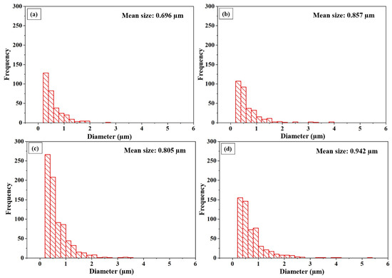 Size distribution histograms of embedded shots onto surfaces of shot-peened AA1050 alloy at (a) 0.1 MPa and 100% cover rate, (b) 0.1 MPa and 1000% cover rate, (c) 0.5 MPa and 100% cover rate, and (d) 0.5 MPa and 1000% cover rate.