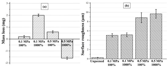 To further understand the variation in surface integrity as a function of SP pressure and cover rate, the variation in mass loss and Ra was illustrated (Figure 7). At 0.1 MPa, mass loss increases with the higher cover rate, most probably due to the removal of plastically deformed surface features (e.g., ridges of formed craters) by the repeated impact of shots. By contrast, mass loss decreases with the higher cover rate at 0.5 MPa, indicating that the embedding of shots is more predominant at 0.5 MPa due to the higher impact energy of shots. The variation in mass loss agrees well with previously discussed surface morphologies as a function of SP pressure and cover rate (Figure 3 and Figure 4). The Ra of shot-peened surfaces is remarkably higher than that of the unpeened surface (Figure 7b), clearly proving the surface modification with SP. The Ra is around 5 µm at 0.1 MPa (while around 9 µm at 0.5 MPa), agreeing well with the corresponding SEM images of surface morphologies and cross-sectional microstructures. Considering the standard deviation of Ra shown (Figure 7b), the influence of the cover rate on Ra can be ignored.