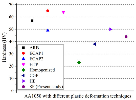 Comparison of obtained hardness values of AA1050 through ECAP1 [20], ECAP2 [77], HPT [31], ARB [17], CGP [71], HE [77], SP, homogenisation annealing.