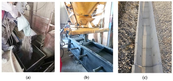 Fabrication of a pilot-scale prototype in an industrial setting: (a) manual addition of WBA during concrete mixing; (b) filling of curb molds; (c) prefabricated drainage elements.
