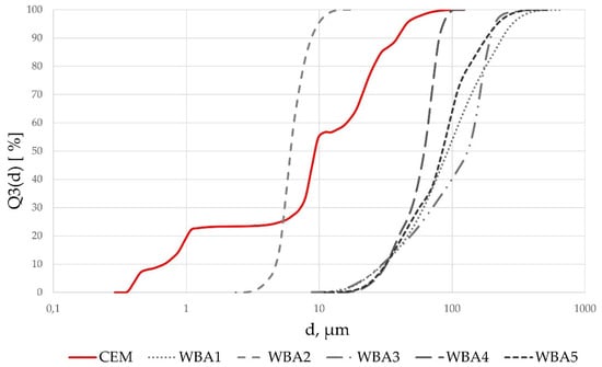 Particle size distribution of WBA and cement samples.