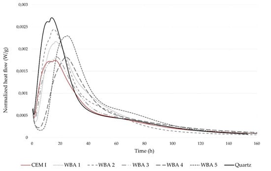 Heat flow of the reference paste (CEM I) without substitution, pastes with 15 wt% WBA, and paste with 15 wt% quartz, obtained by isothermal calorimetry.