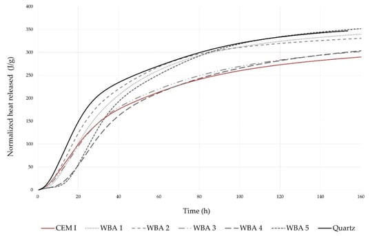 The effect of WBA on binder hydration was studied by monitoring the heat release with isothermal calorimetry. Figure 4 shows the heat release rate of cement paste with 15 wt% WBA, where the flow rate was normalized to g of cement in order to indicate its reactivity. It can be seen that the use of WBA in the cement pastes changed the hydration kinetics: the induction period was prolonged by the addition of WBA, regardless of the type and chemical properties of WBA. This is consistent with previous studies [51,72]. The delay in the induction period of pastes containing WBA, displayed in Figure 4, is explained in the literature by the supersaturated state with calcium oxides [44]. They observed that the presence of the blended coal—wood ashes retard cement hydration, delaying the induction period as the time to reach the supersaturated state was prolonged. The delay in C3S hydration is also attributed to the incorporation of alumina and organic ions [73]. Moreover, the addition of WBA resulted in increased peaks, especially in paste blends, in which WBA2 and WBA5 were used. It is known that the addition of pozzolans increases the effective ratio of water to Portland cement and provides an additional surface for nucleation and growth of hydrates, leading to an increase in the heat of hydration [74,75]. Compared to the other samples, WBA5 had a significant amount of pozzolanic oxides, which may have contributed to the increase in heat of hydration. WBA2 had the smallest particles of all the WBAs tested, with half of the particles smaller than 6.10 µm, showing the heat flow curve most similar to the inert quartz. The cumulative heat of hydration after 167 h is shown in Figure 5. The results show higher cumulative heat for the pastes with WBA compared to the reference mix (292.32 J/g cement) as follows (from the highest to the lowest value): WBA5 (354.23 J/g cement) WBA1 (342.06 J/g cement) WBA2 (332.43 J/g cement) WBA4 (306.53 J/g cement) WBA3 (304.49 J/g cement). Based on the hydration analysis, prolonged setting time and lower early compressive strength of composites with WBA can be expected.