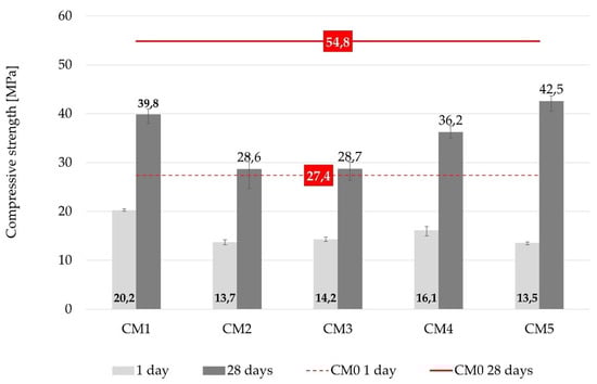 The effects of each WBA on mechanical performance of concrete were analyzed based on the demonstrated compressive strength. Thus, the differences between each WBA were reflected in the values of compressive strength of concrete with WBA, evaluated in relation to the control mix CM0 (Figure 6 and Figure 7). From the absolute results of the compressive strength (Figure 6), the reduction in compressive strength was visible, displaying a similar trend for all concrete mixtures after 1 and 28 days. The drop of compressive strength after 1 day differed between 26% (CM1) to 51% (CM5), relative to the control mix. These lower values of early compressive strength can be related to the heat of hydration, where a similar trend was observed (Figure 4 and Figure 5). A stagnant increase in strength was investigated by [17] analyzing six different WBAs and different ash contents at early ages. It was found that the use of WBA reduced the early compressive strength due to high content of free CaO, free MgO, LOI and alkali. At 28 days, the compressive strengths of all the mixtures with WBA content of 15 wt% were lower than that of the reference mix, with downturns ranging from 22% (CM5) to 48% (CM2 and CM3). WBA2 had higher alkali (10.39 wt%) and LOI (19.7 wt%) content compared to the other WBA samples, which can be associated with the lower values of compressive strength [78,79], while WBA3 had coarser particles compared to cement and the other WBAs, which may have led to a decrease in the compressive strength of the CM3 mixture. The negative impact of the reduced value of d50 in WBA2 may also be related to compressive strength drop. The compressive strength increased as the concrete aged, but none of the specimens tested achieved a higher compressive strength than the control mix. Other authors have also confirmed that the use of WBA as a cement replacement in concrete can decrease compressive strength values after 28 days [53,67,68,80,81,82,83,84,85,86,87,88].