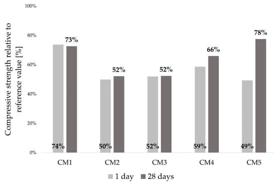 Compressive strength of concrete mixtures relative to the reference values after 1 and 28 days.