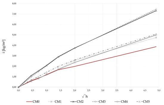 Capillary absorption of precast concrete is not quantified in the EN 1340 standard [89], but specimens with WBA have been tested, as this is one of the main mechanisms of penetration into the concrete surface by which concrete degradation occurs. The capillary absorption of the concrete specimens as a function of root time after 28 days and the values of the sorption coefficients of the concrete mixtures are shown in Table 8 and Figure 8. The increase in the sorption coefficient values compared to the control mix was 56%, on average, for the samples with WBA, from 27% for the CM1 mixture (0.96 kg/m2√h) to 96% for the CM3 mixture (1.48 kg/m2√h), Figure 8. Based on the given results, the adverse effect of WBA on capillary absorption of concrete samples was observed. As noted by [17,90], moderate cement replacement in the content of 5 wt% to 10 wt% leads to a decrease in the sorption coefficient, while the replacement of 15 wt% cement in this study had an opposite effect. When measuring the increase in weight due to capillary absorption over time, all samples with WBA showed increased values compared to the control mix CM0 (Figure 8). Comparing the mixtures with WBA among themselves, it can be seen that mixtures CM1, CM4, and CM5 showed better results, i.e., lower capillary absorption, than mixtures CM2 and CM3. Moreover, the slope of the CM0 curve decreased after 1.5 √h, which was probably due to the filling of the capillary pores. The same point was not so clear-cut for the samples with WBA, which was probably due to the structure of the cement matrix, i.e., the incorporation of WBA led to an increase in the number of capillary pores [48]. A low Na2Oeq content is common in SCMs, but a higher content, as found in the WBA2 specimens, may have a negative effect on the durability of concrete [17].